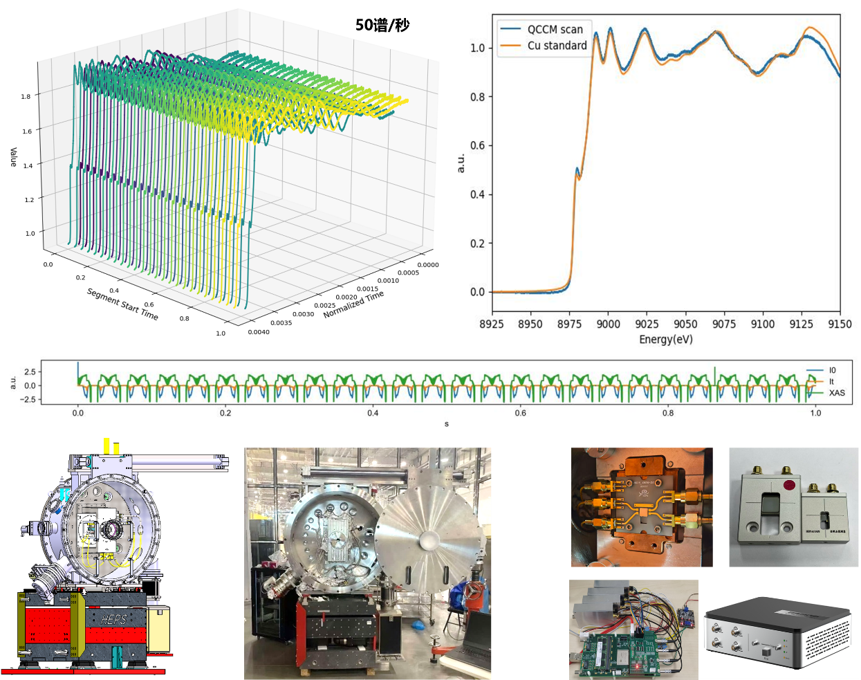 CuXANES随时间的谱图展示及其与常规步进采集数据的对比。X射线吸收谱学线站:HEPS团队通过全套自研设备(快扫单色器及运动控制、金刚石探测器及采集电子学),实现了单谱20ms50/秒)的XANES时间分辨能力
